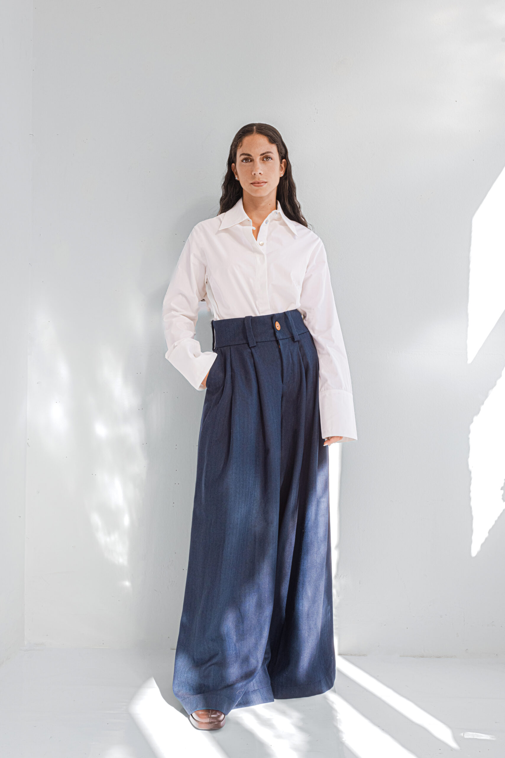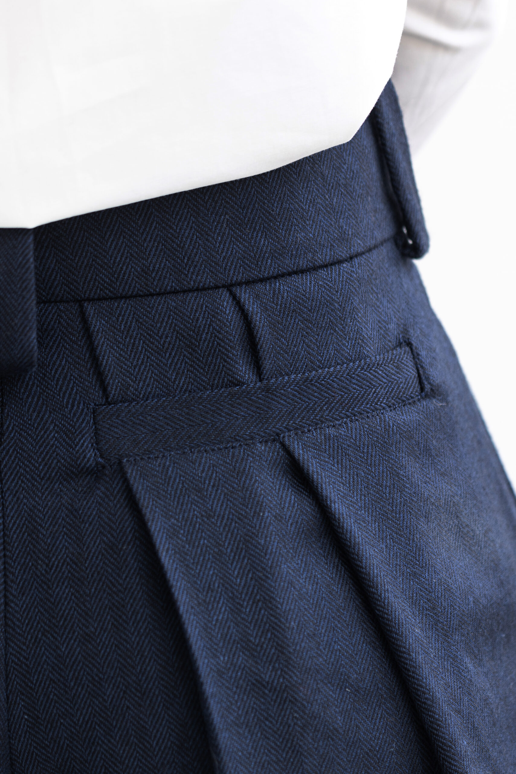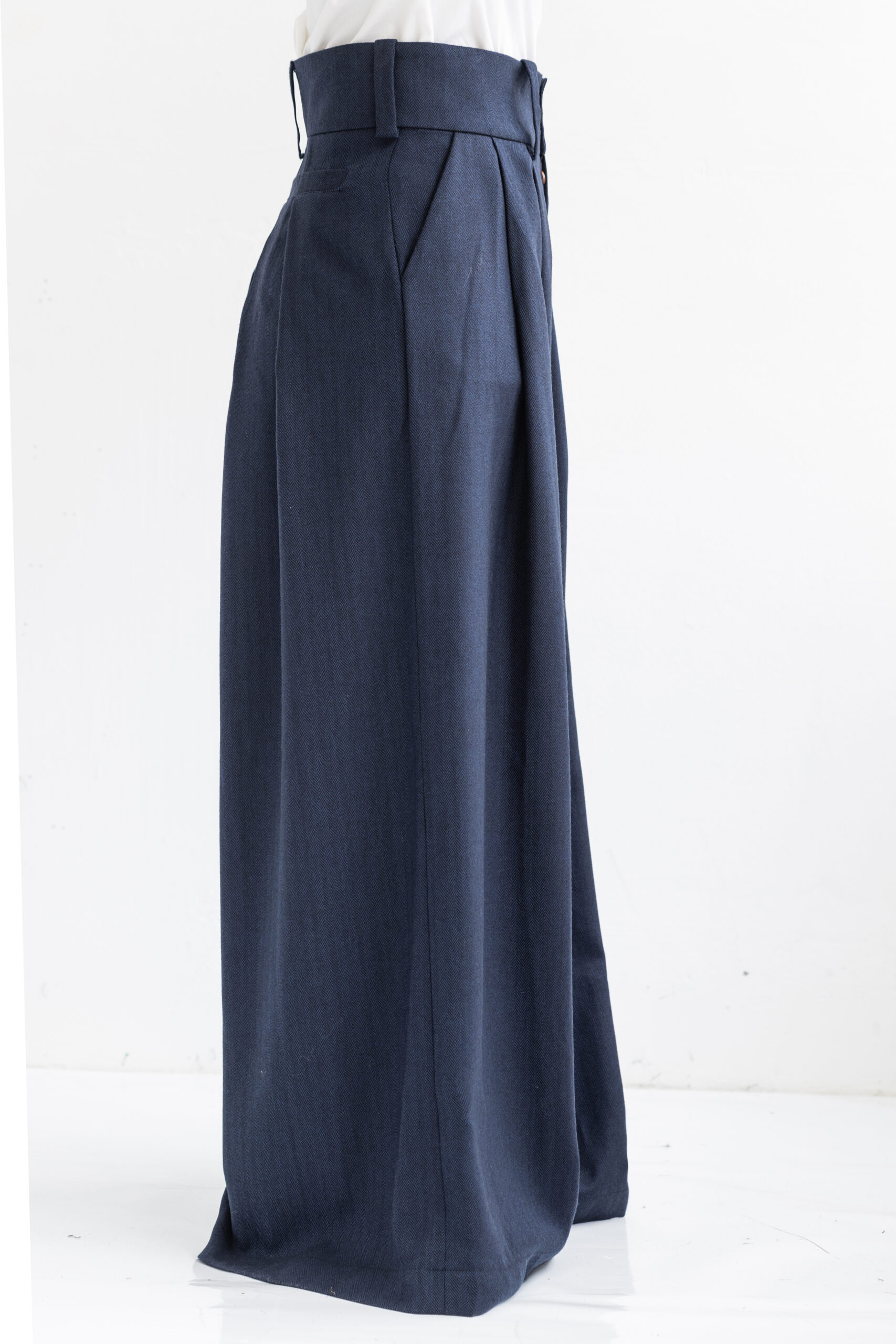 La inspiración para este pantalón ha sido la bohemia de los años 70 y el porte aristocrático de las pinzas, cintura alta y la sastrería tradicional. Confeccionado con lana merina española en espiga y en color azul marino.