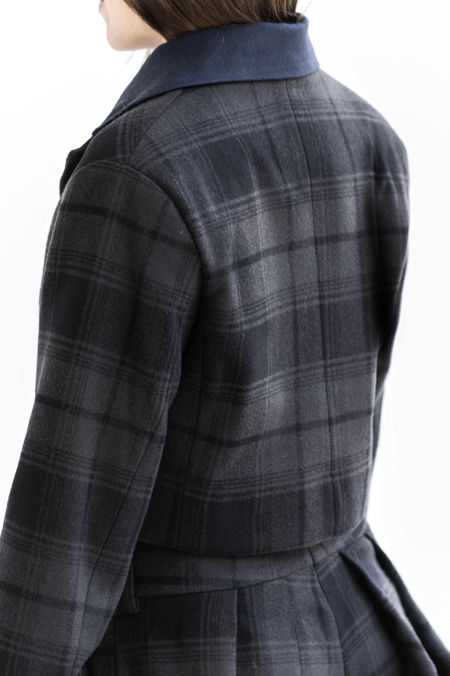 La inspiración para esta torera ha sido el traje de flamenco andaluz y la bohemia de los años 70 gaditana. Las mangas de estilo evasé con volante recrean el típico traje de flamenca. Confeccionado con lana 100% española en tartán gris y negro.